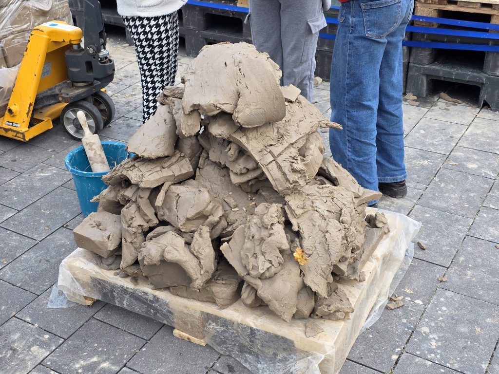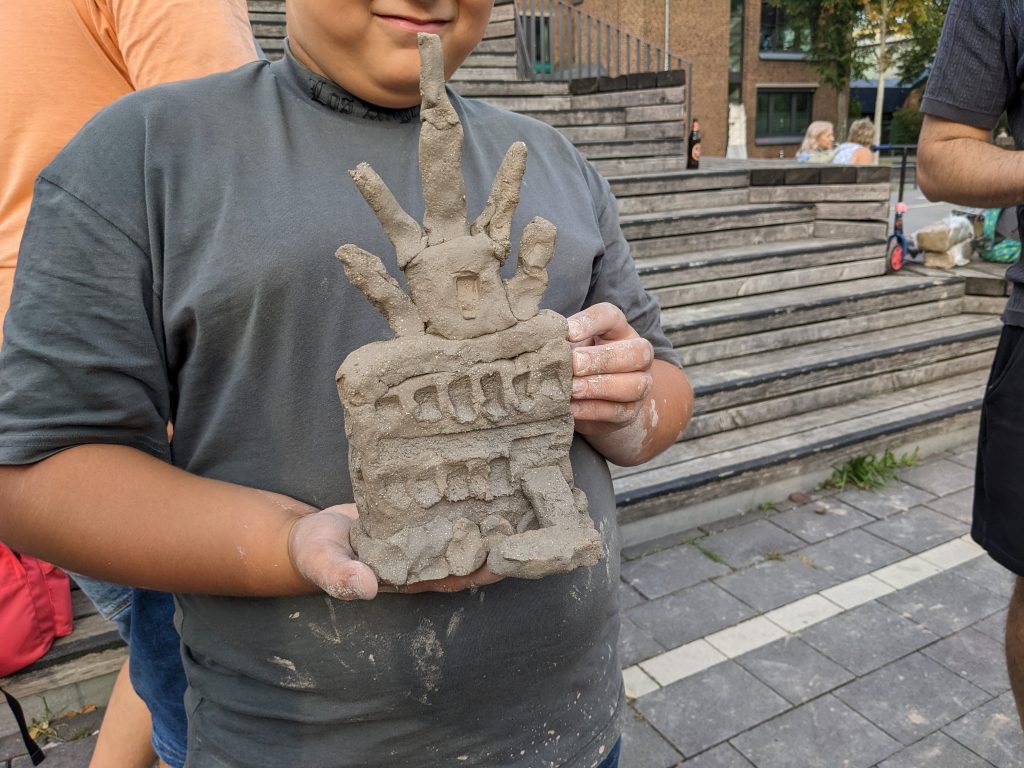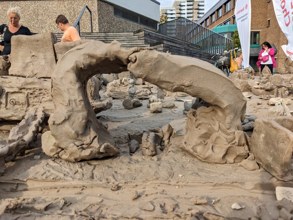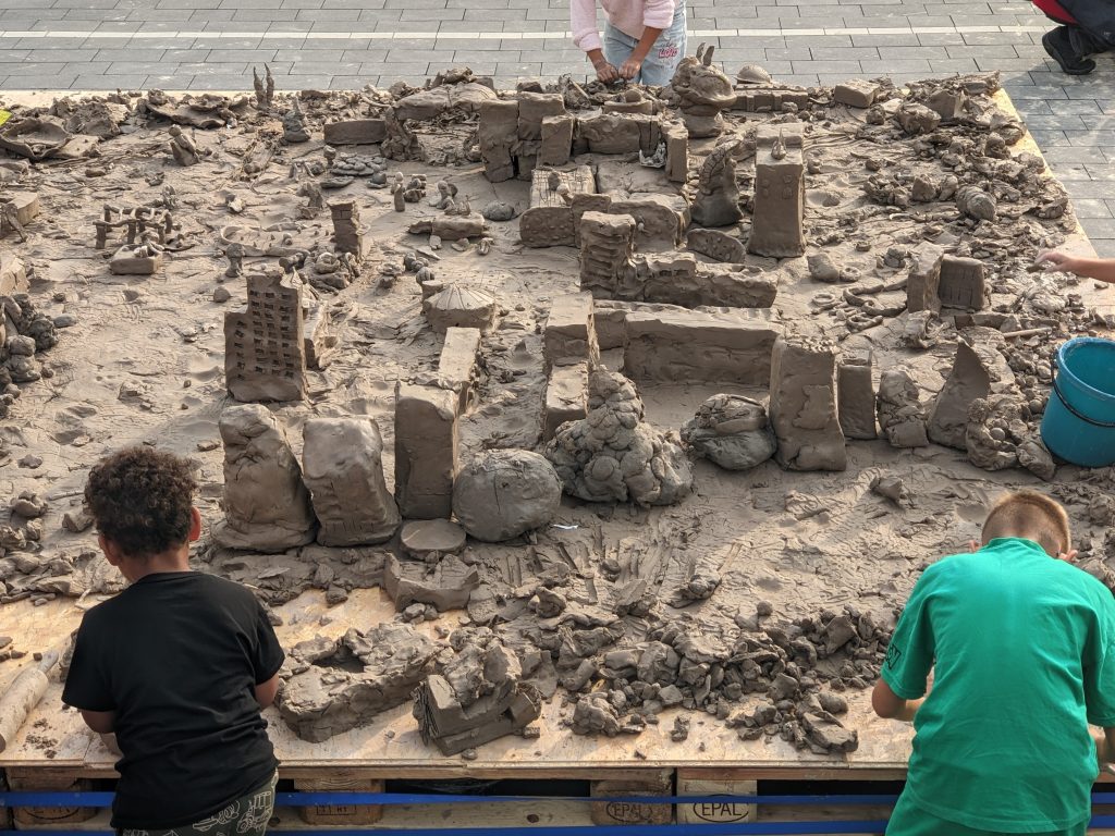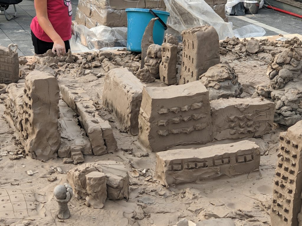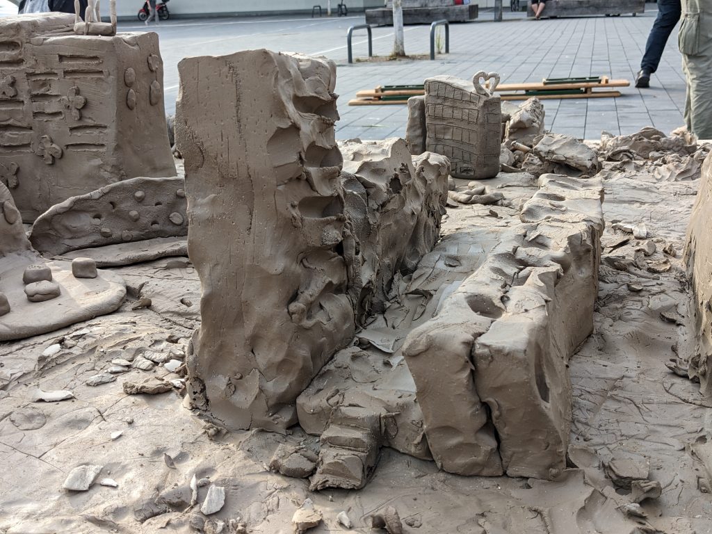 Mit Chorweiler in Ton ging es uns deshalb in erster Linie darum, einen Ort herzustellen, an dem solche Begegnung stattfinden kann, jenseits eines explizit politischen Diskurses, aber dafür umso stärker an ein gemeinsam geteiltes Thema anknüpfend, nämlich den gemeinsam bewohnten, physischen Ort, und verbunden mit einem bleibenden Erlebnis: Es standen drei Tonnen (!) Ton zur Verfügung, um auf einer 4 x 4 Meter großen Plattform gemeinsam den Stadtteil nachzubauen. Dass sich daraus kein topografisch exaktes Abbild ergeben würde, stand von vornherein fest und war auch nicht Sinn der Übung. Vielmehr ging es uns darum, die Menschen über das Modellieren, z.B. ihres Lieblingsortes oder des eigenen Wohnhauses, ins Erzählen zu bringen. Diese Geschichten wurden festgehalten (u.a. durch separat am Rand geführte Videointerviews, aber auch durch Notizen und Tonaufnahmen der Bündnispartner) und werden gesammelt. Sie stellen die eigentliche „Ernte“ des Projekts dar, denn das Tonmodell selber kann aufgrund seiner Größe nicht gebrannt, sondern nur als Material (in diesem Fall durch die Jugendwerkstatt Chorweiler) wiederverwendet werden.