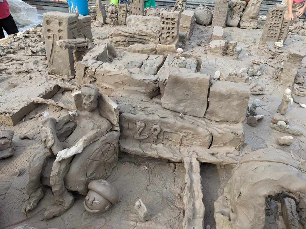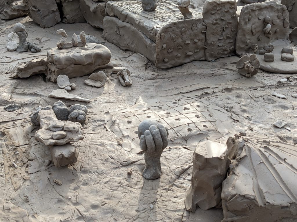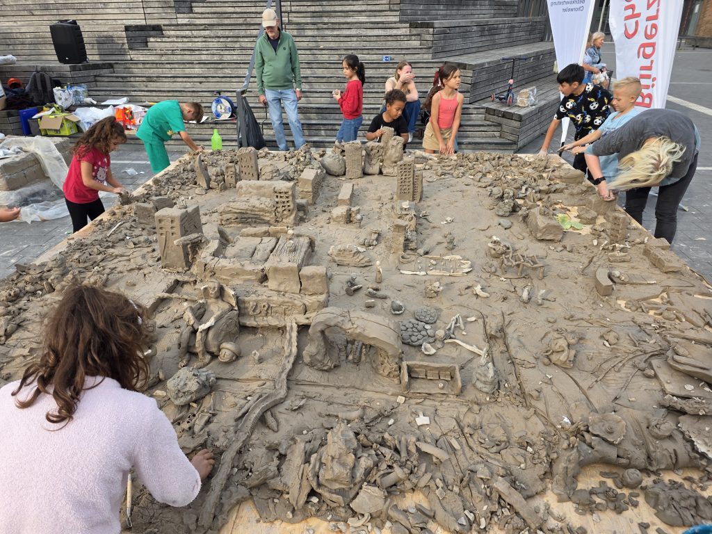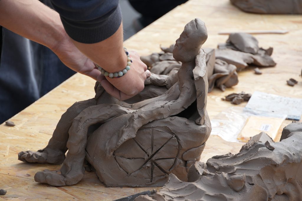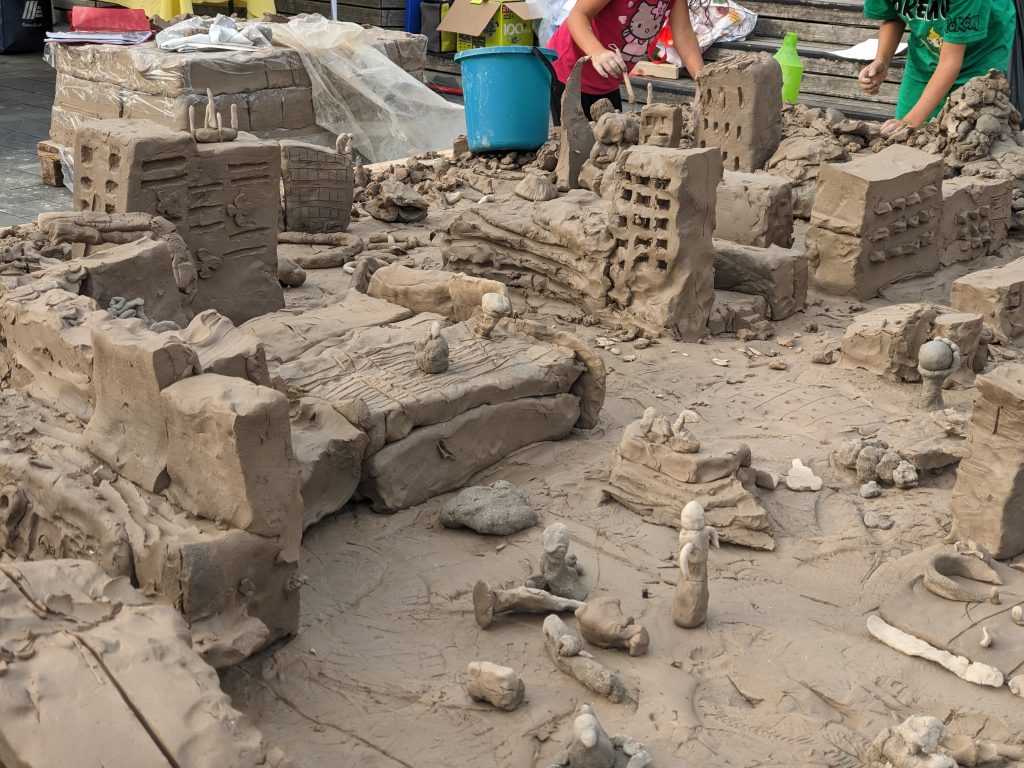 Mit Chorweiler in Ton ging es uns deshalb in erster Linie darum, einen Ort herzustellen, an dem solche Begegnung stattfinden kann, jenseits eines explizit politischen Diskurses, aber dafür umso stärker an ein gemeinsam geteiltes Thema anknüpfend, nämlich den gemeinsam bewohnten, physischen Ort, und verbunden mit einem bleibenden Erlebnis: Es standen drei Tonnen (!) Ton zur Verfügung, um auf einer 4 x 4 Meter großen Plattform gemeinsam den Stadtteil nachzubauen. Dass sich daraus kein topografisch exaktes Abbild ergeben würde, stand von vornherein fest und war auch nicht Sinn der Übung. Vielmehr ging es uns darum, die Menschen über das Modellieren, z.B. ihres Lieblingsortes oder des eigenen Wohnhauses, ins Erzählen zu bringen. Diese Geschichten wurden festgehalten (u.a. durch separat am Rand geführte Videointerviews, aber auch durch Notizen und Tonaufnahmen der Bündnispartner) und werden gesammelt. Sie stellen die eigentliche „Ernte“ des Projekts dar, denn das Tonmodell selber kann aufgrund seiner Größe nicht gebrannt, sondern nur als Material (in diesem Fall durch die Jugendwerkstatt Chorweiler) wiederverwendet werden.