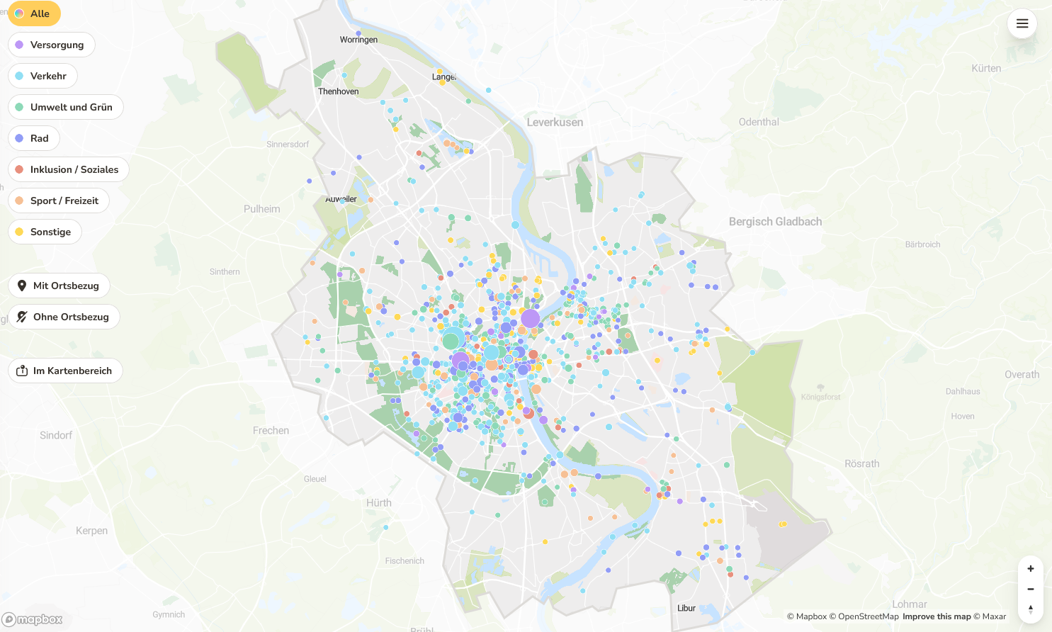 Zur Erinnerung: Mit „Dein Senf für Köln“ steht allen Kölnerinnen und Kölnern seit 2022 ein großartiges, kartenbasiertes Tool zur Verfügung, um Kritik, Ideen und Verbesserungsvorschläge für ihre Stadt einzubringen und zu sehen, was andere vorgeschlagen haben.