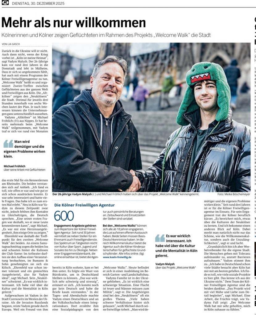 Die Kölnische Rundschau berichtet in einem sehr schönen Artikel über den WelcomeWalk vom Vadym und Michael. „Köln ist meine Heimat“ sagt Vadym schon drei Jahre, nachdem er aus der Ukraine nach Köln kam. Auch Michael nimmt durch sein Engagement einiges mit „Man wird demütiger und die eigenen Probleme wirken klein“ sagt er. Lust auf einen WelcomeWalk? Hier kannst du dich anmelden: Link