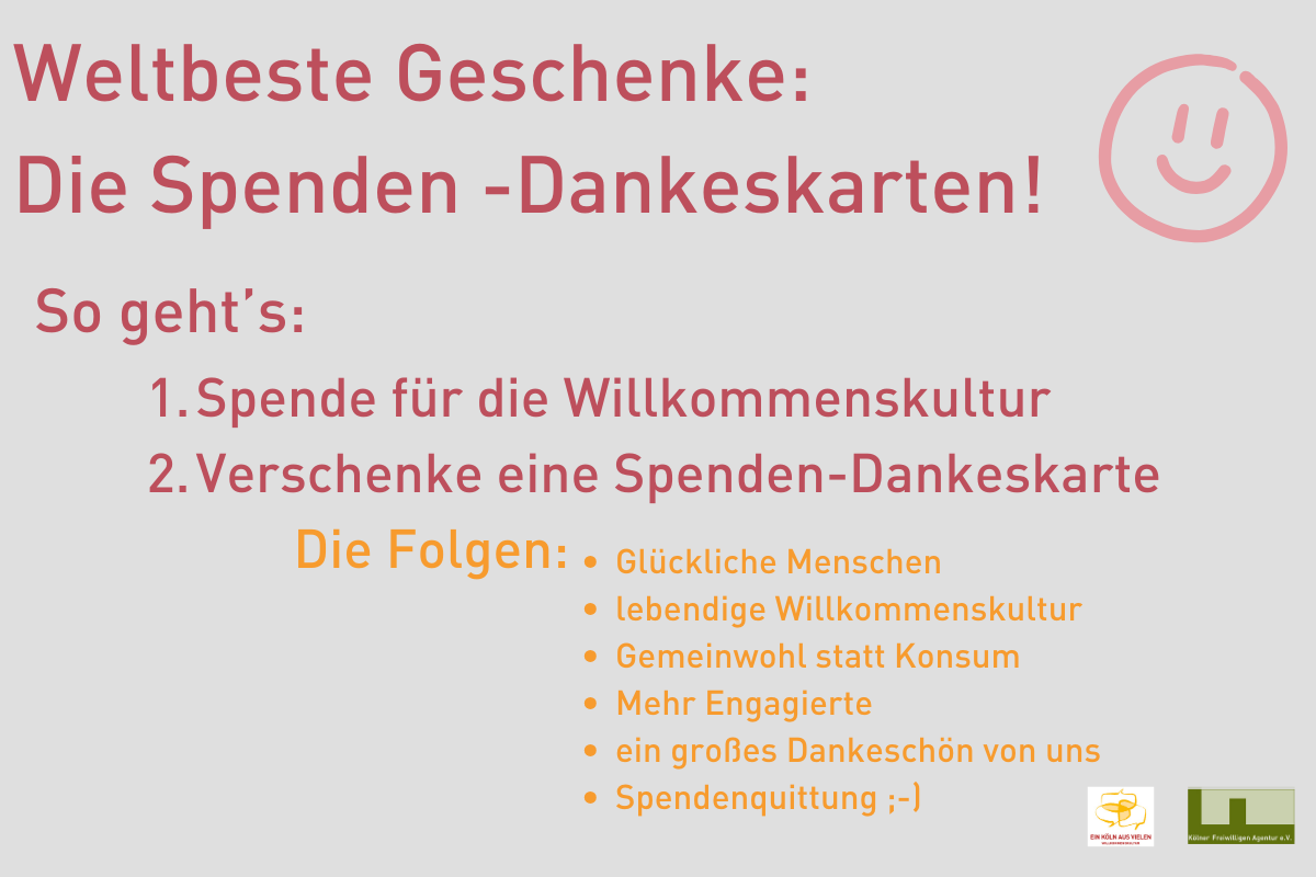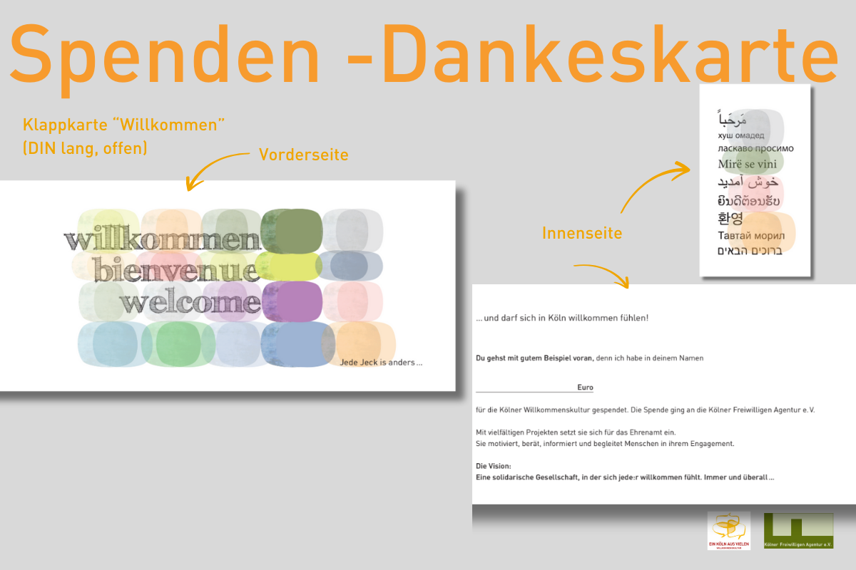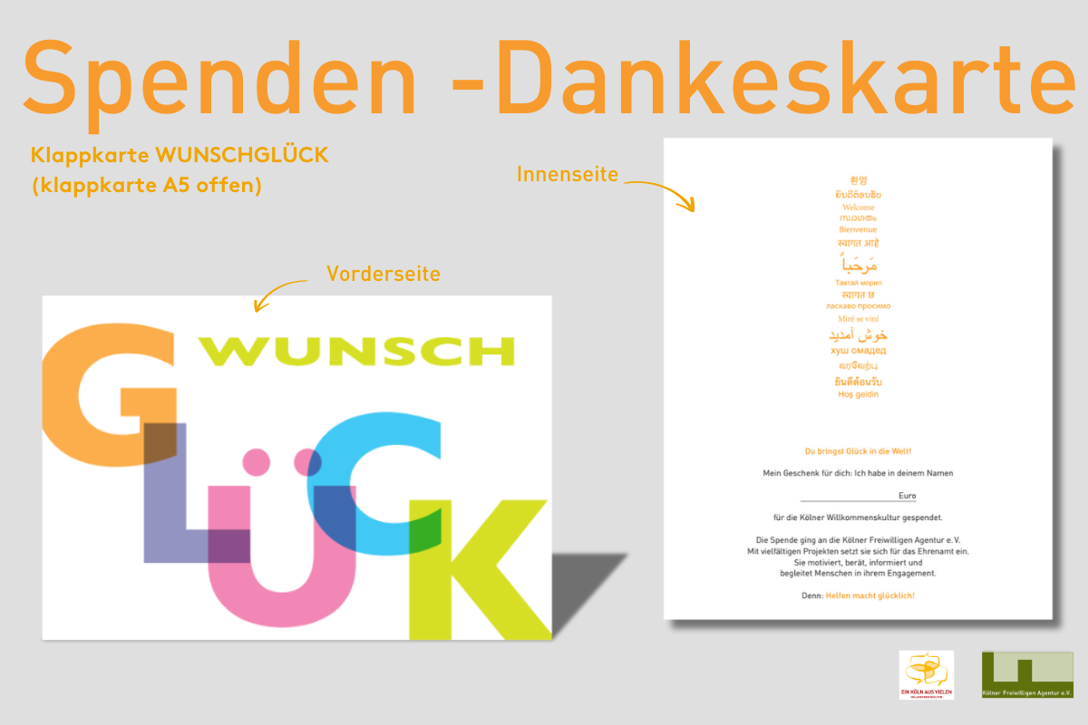 - Du spendest im Namen der beschenkten Person für den Bereich Willkommenskultur der Kölner Freiwilligen Agentur. Die Mindestspende pro Karte beträgt 25€.