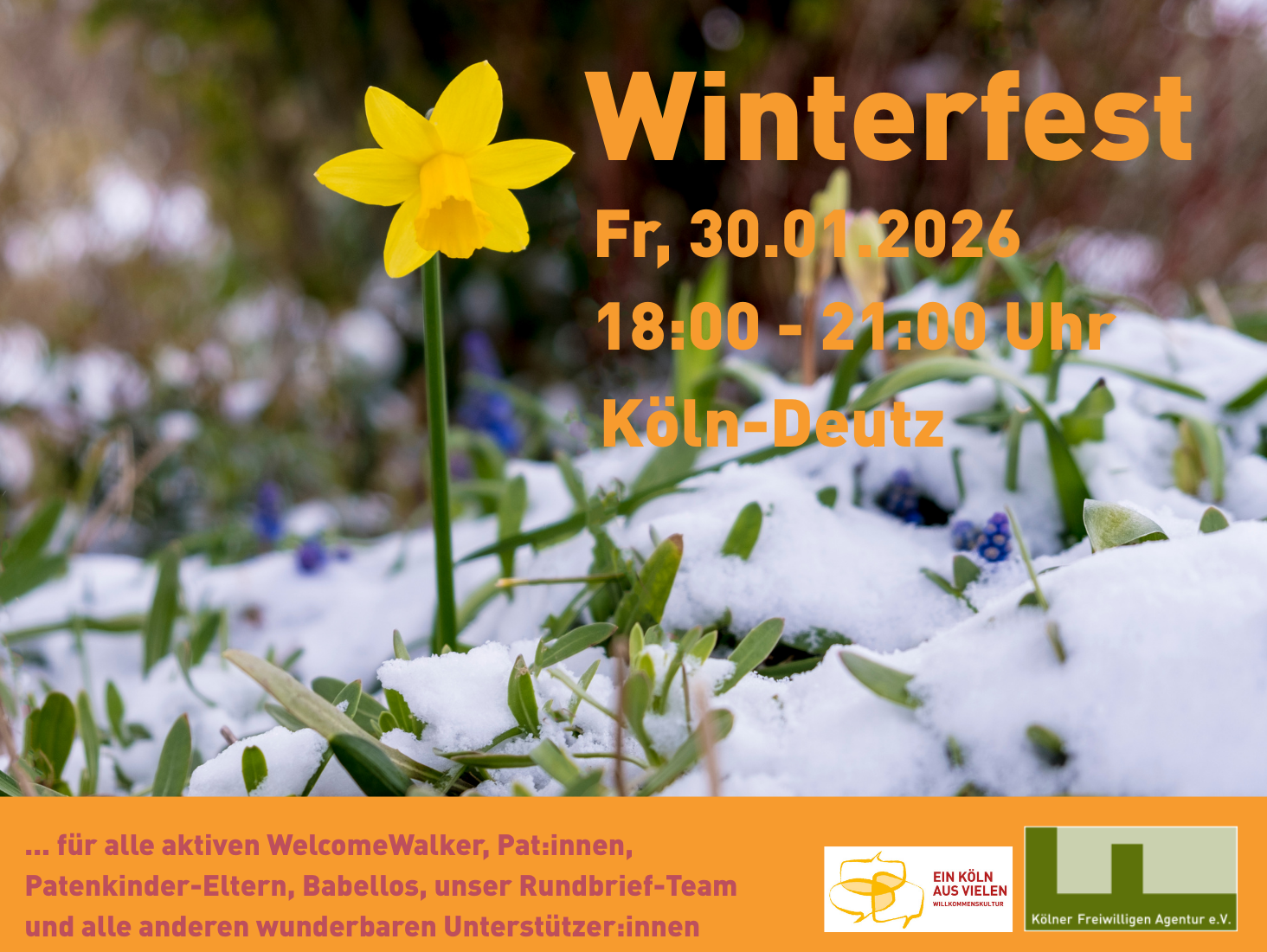 Und daher laden wir sie alle zu unserem Winterfest Willkommenskultur ein! Es findet statt am Freitag, 30.01.2026, von 18:00 – 21:00 Uhr in Köln-Deutz.